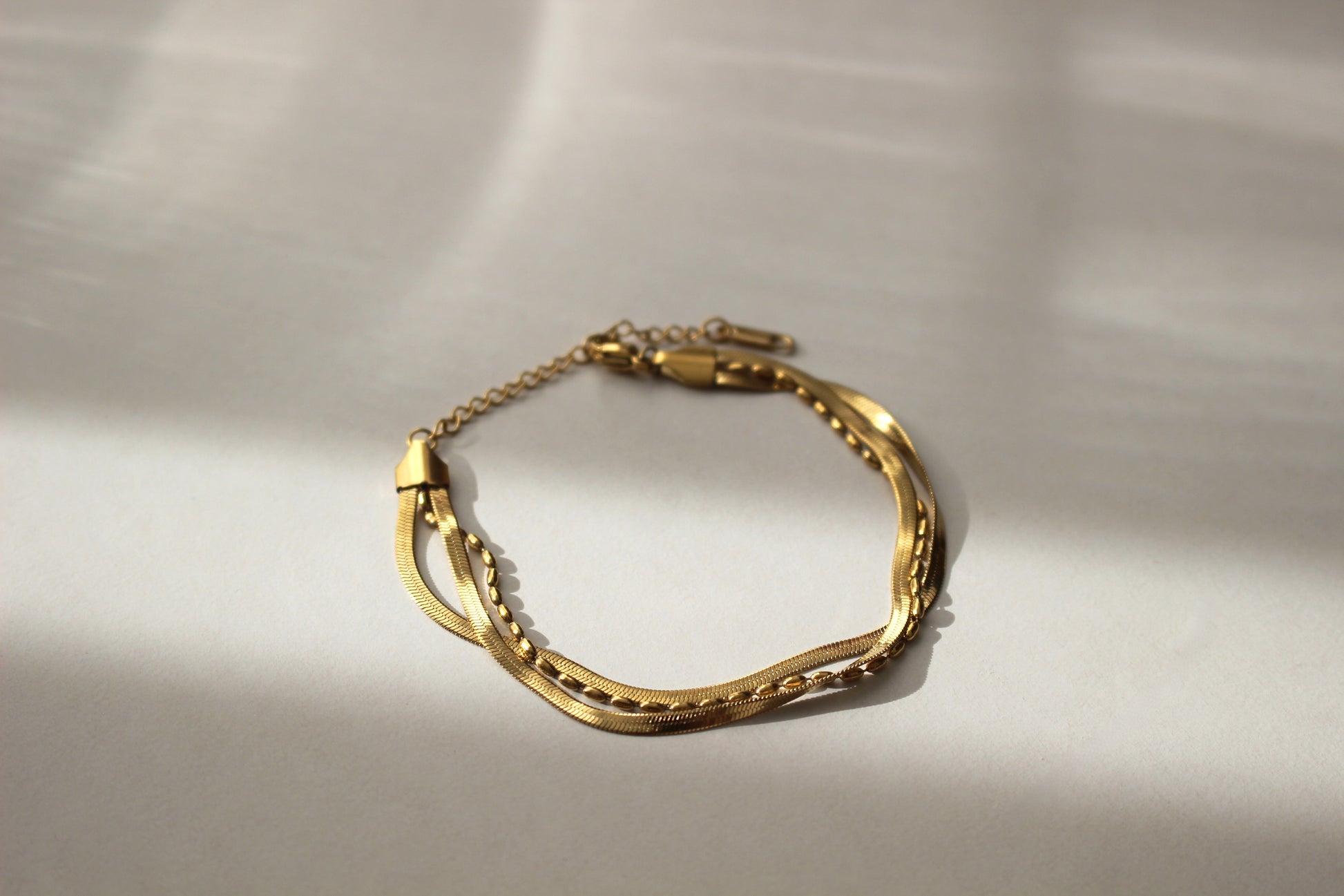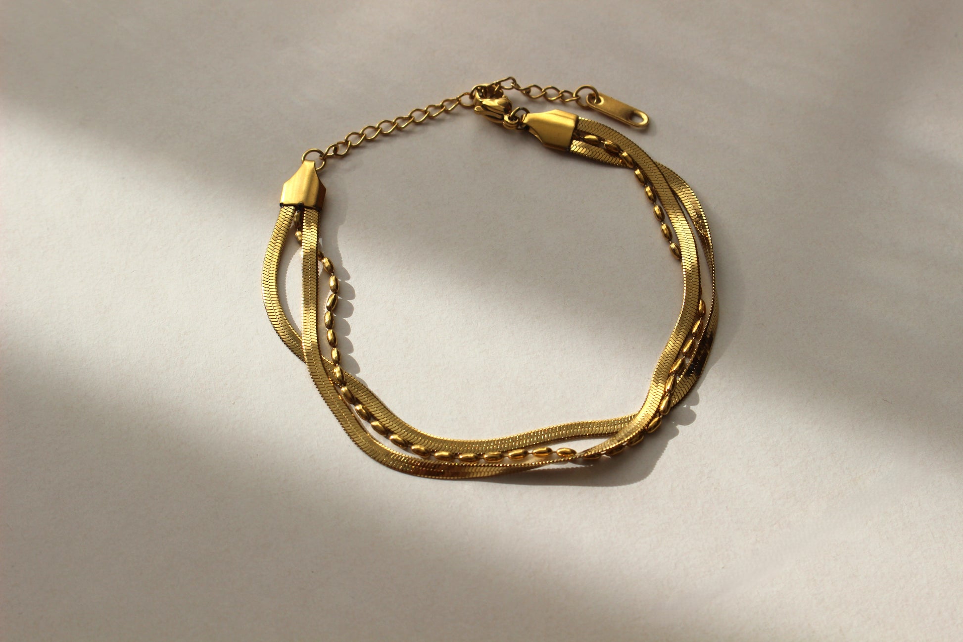 El brazalete Elise combina tres cadenas de acero resistentes al agua y al deslustre 💧💎, ofreciendo durabilidad y elegancia en un diseño sofisticado. Ideal para uso diario y ocasiones especiales.