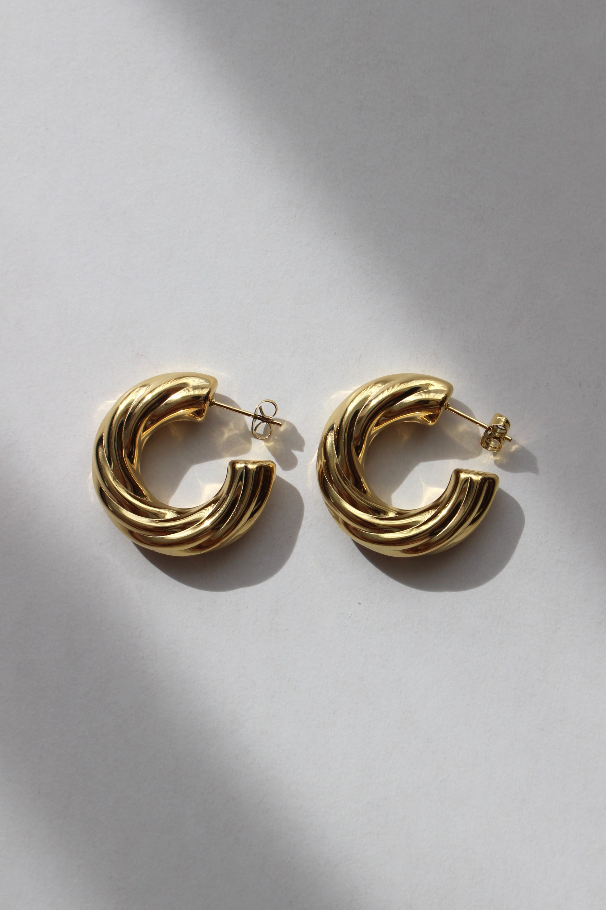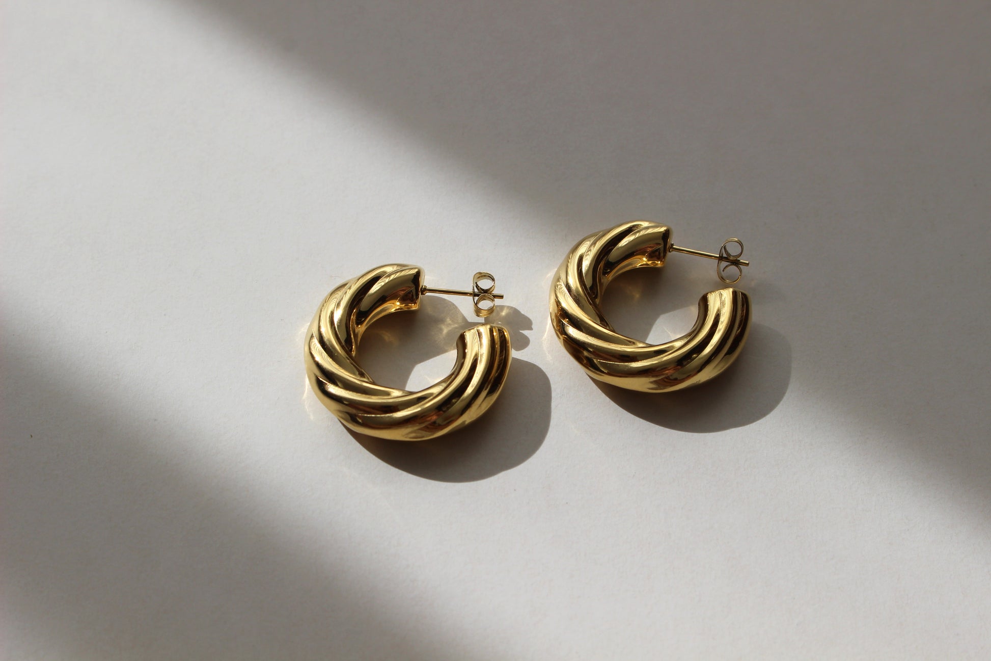 Aretes con acabado en acero titanio, bañados en oro de 18 quilates.