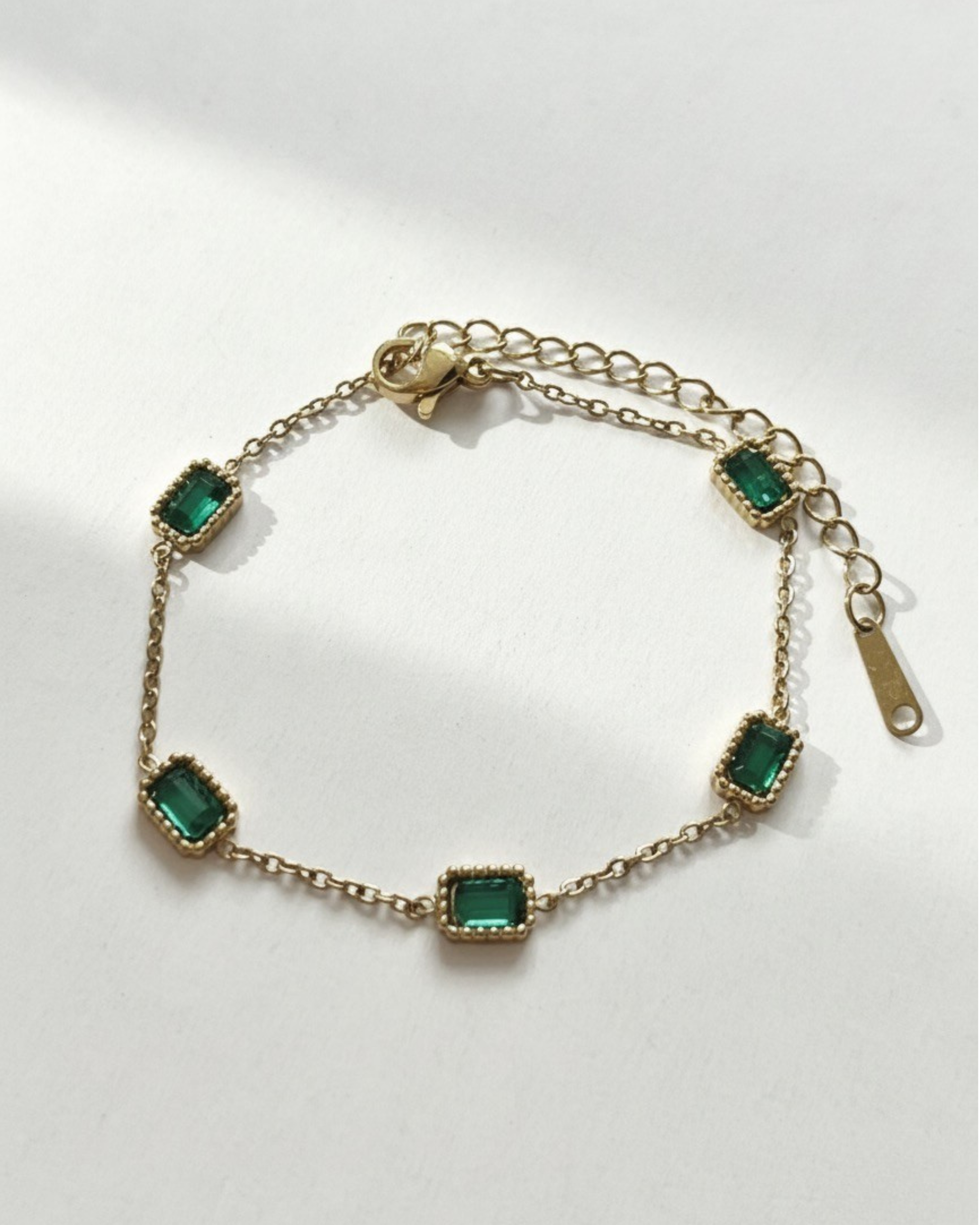 Pulsera confeccionada en acero inoxidable de alta calidad, adornada con piedras que emulan la elegancia de las esmeraldas. Un accesorio versátil que combina durabilidad con un acabado sofisticado, ideal para complementar tanto looks cotidianos como ocasiones especiales.