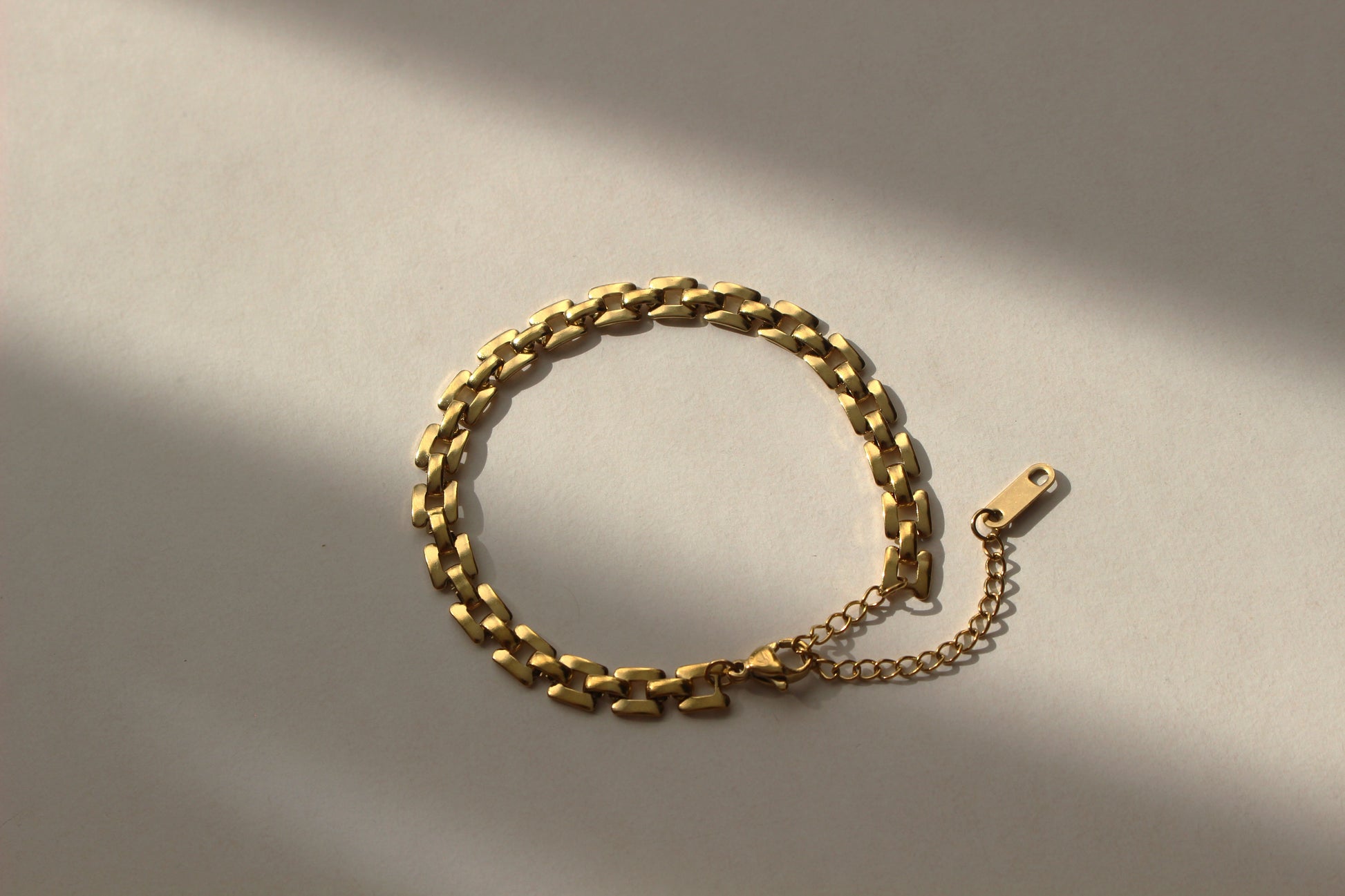 Pulsera de cadena con diseño geométrico, fabricada en acero inoxidable 316L. Presenta un estilo básico y sencillo, con resistencia al agua y a la decoloración, garantizando durabilidad gracias a su material quirúrgico de alta calidad.